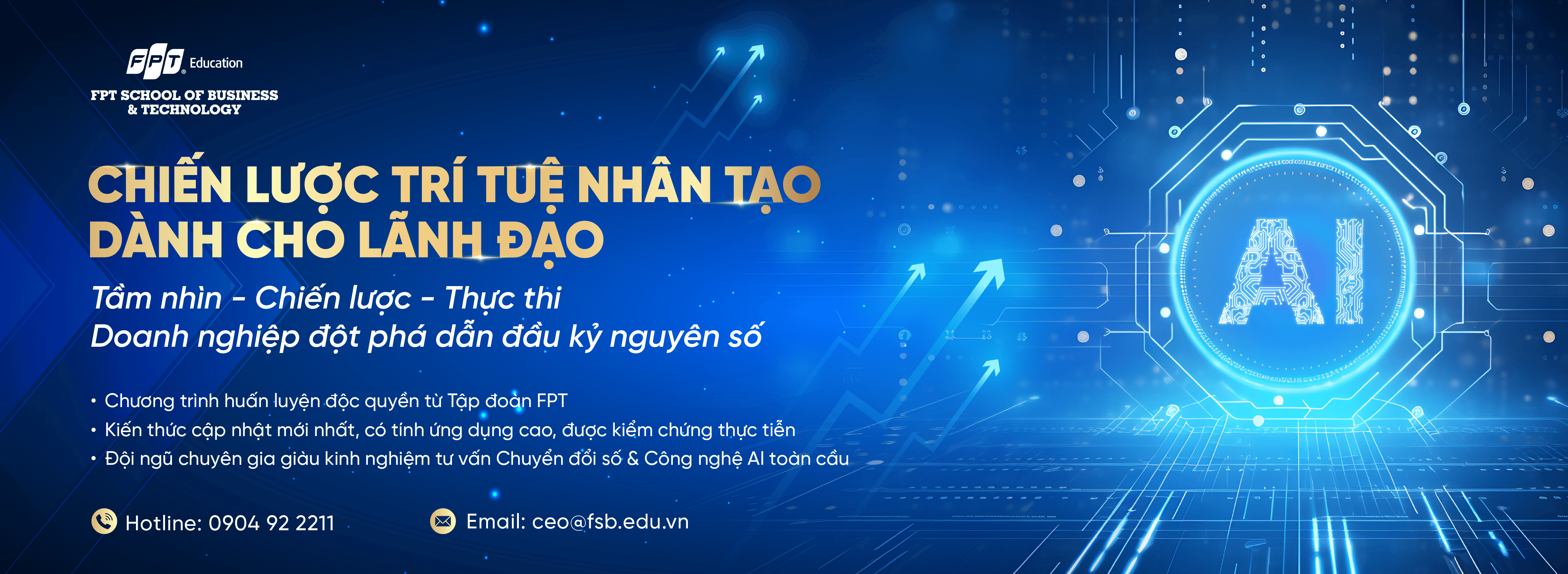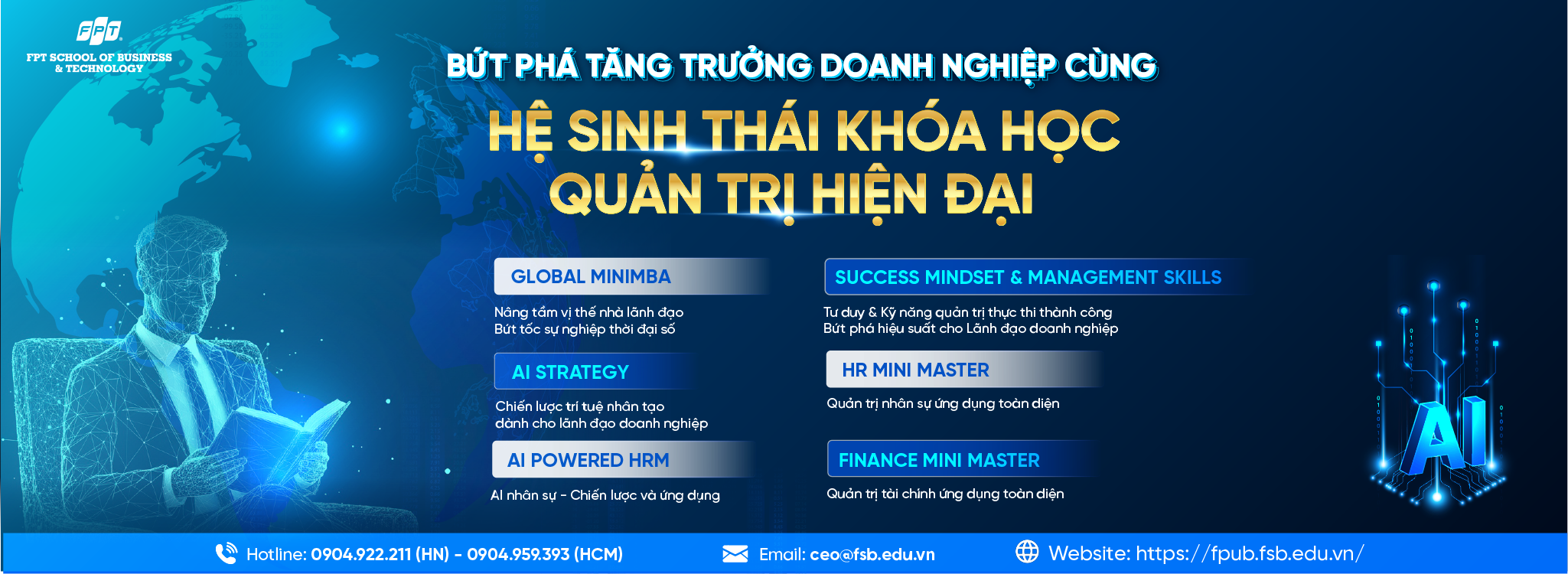 Viện Quản trị & Công nghệ FSB là Viện đào tạo sau đại học trực thuộc Đại học FPT, Tập đoàn FPT. Với kinh nghiệm trên 20 năm đào tạo về Quản trị – Điều hành – Lãnh đạo, Viện Quản trị & Công nghệ FSB tự hào là Trường Kinh doanh hàng đầu tại Việt Nam theo bình chọn của Eduniversal năm 2020 (tổ chức xếp hạng các trường về kinh doanh uy tín trên thế giới).