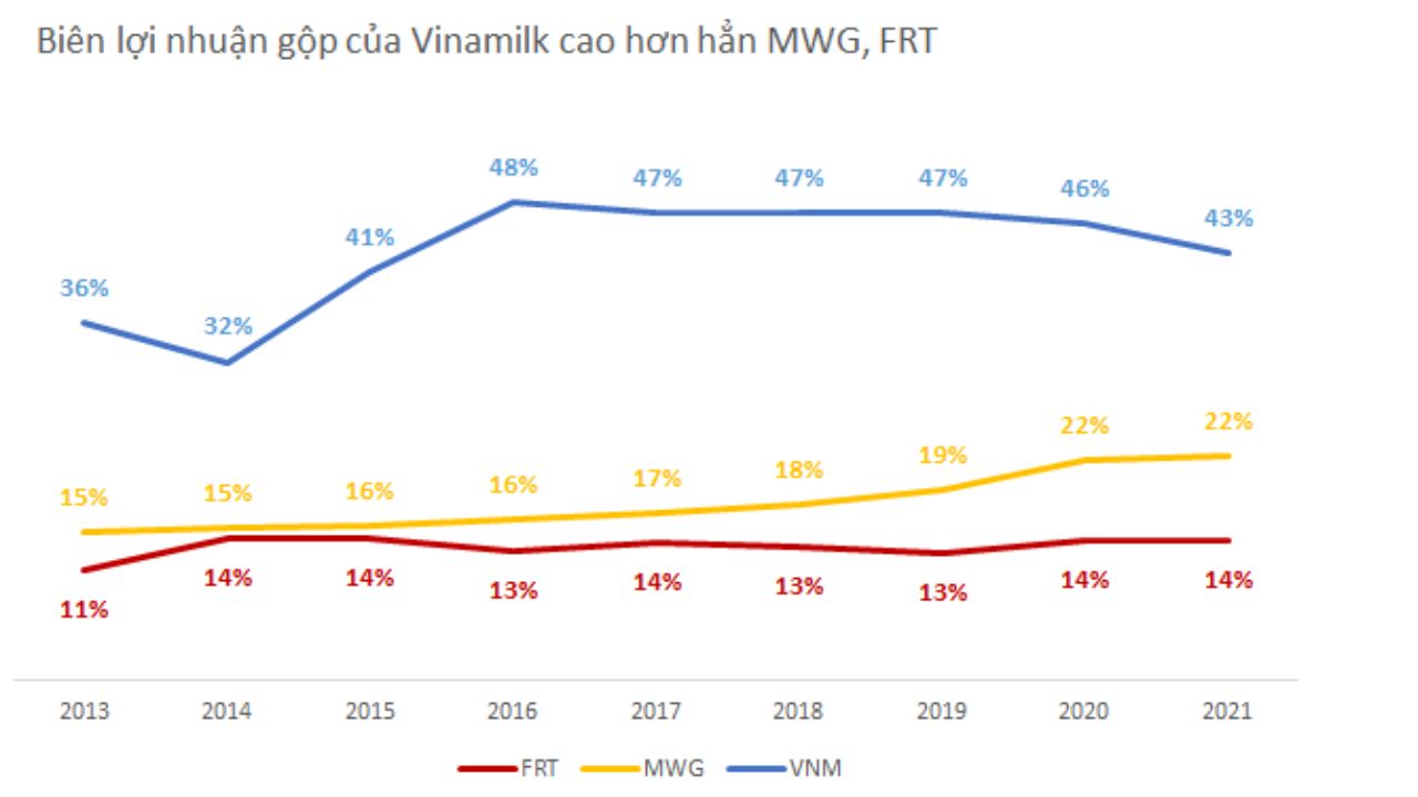 Vinamilk luôn duy trì mức biên lợi nhuận gộp trên 30%, thậm chí đạt đỉnh 48% vào năm 2016 và duy trì đều đặn 47% trong vài năm sau. Trong khi đó 2 doanh nghiệp thương mại là Thế giới di động và FPT cao nhất luôn có mức thấp hơn 25%. Cụ thể trong 2 năm gần đây Thế giới di động mới đạt được biên lợi nhuận gộp 22%, còn trước đó luôn ở mức dưới 20%. FPT Retail hiện cũng duy trì mức từ 13-14% biên lợi nhuận gộp.