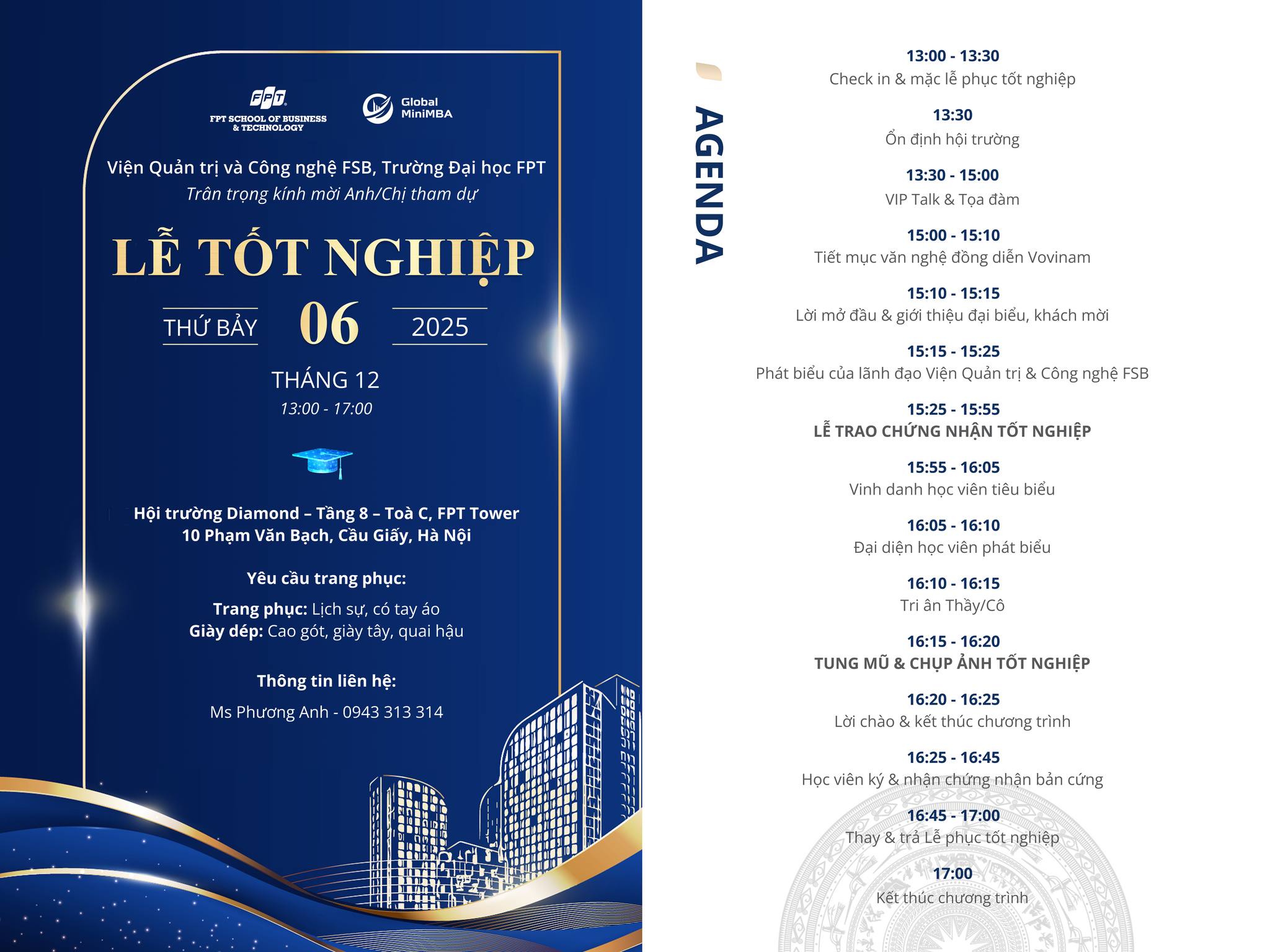 Viện Quản trị & Công nghệ FSB – Trường Đại học FPT trân trọng thông báo tổ chức Lễ Tốt nghiệp và Vinh danh Global MiniMBA Đợt II/2025, sự kiện thường niên nhằm ghi nhận những thành tựu học tập và sự trưởng thành trong tư duy quản trị của đội ngũ học viên là các nhà quản trị và quản lý doanh nghiệp trên toàn quốc.