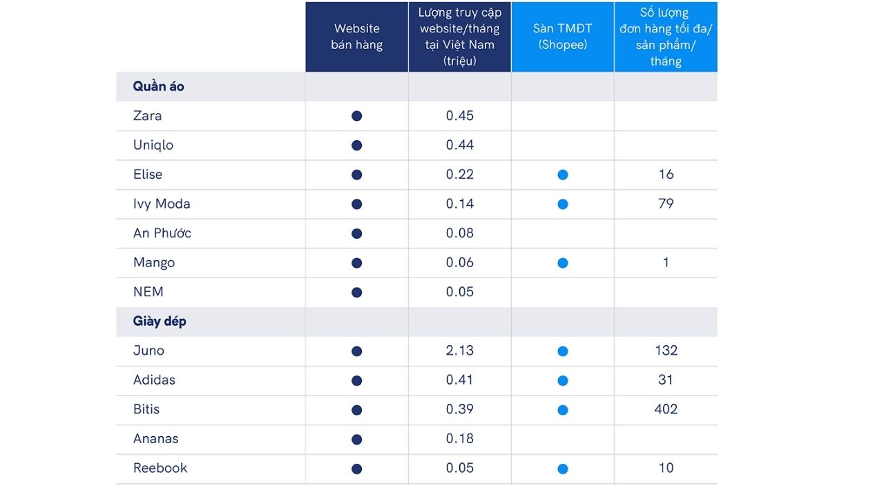 Hầu hết các thương hiệu thời trang quốc tế đang hoạt động tại Việt Nam (VD: Zara, H&M, Uniqlo…) đều không có xu hướng bán hàng trên các sàn thương mại điện tử, hoặc nếu có, rất hạn chế về số lượng sản phẩm cũng như các chương trình khuyến mại. Họ tập trung vào các chương trình trên kênh bán hàng sở hữu như website hoặc trên ứng dụng di động.