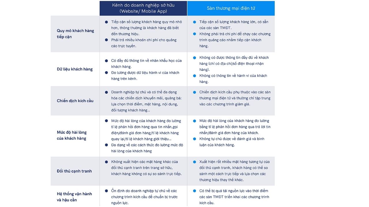 Mô hình kinh doanh trên kênh do doanh nghiệp sở hữu mang tính tự chủ và phù hợp với những doanh nghiệp có quy mô lớn, đã có thương hiệu. Mô hình kinh doanh trên sàn thương mại điện tử thường thích hợp với những đơn vị kinh doanh quy mô nhỏ, không có cửa hàng vật lý và thương hiệu chưa phổ biến với đại đa số người tiêu dùng.
