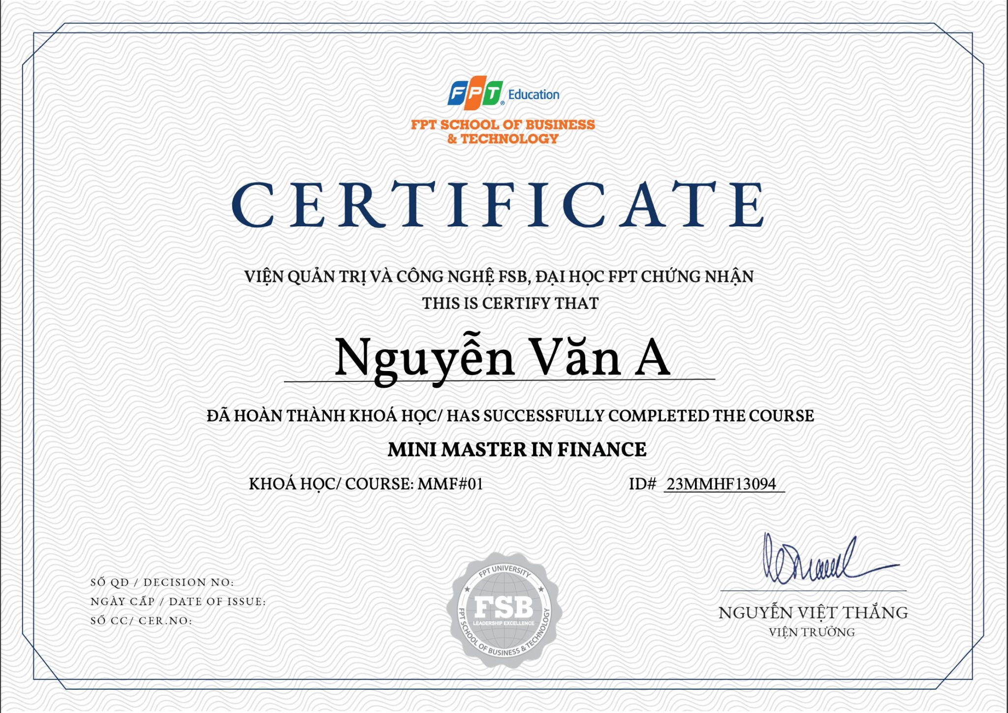 Chứng chỉ hoàn thành từ FSB – Đại học FPT được công nhận rộng rãi bởi cộng đồng doanh nghiệp. Đây là minh chứng cho năng lực quản trị tài chính chuyên nghiệp, tăng uy tín và giá trị bản thân trong con mắt của đối tác, khách hàng và nhà đầu tư.